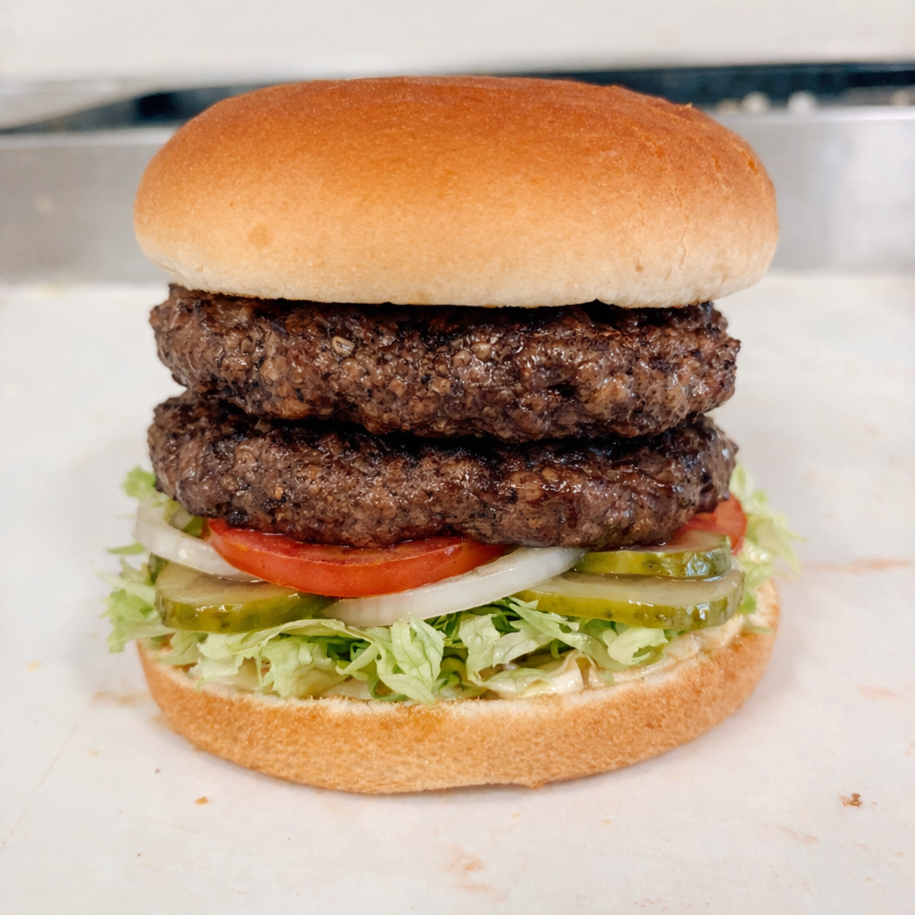 two 1/2 pound fresh ground beef, mustard, lettuce, tomato, onions, pickles. Add cheese $0.75