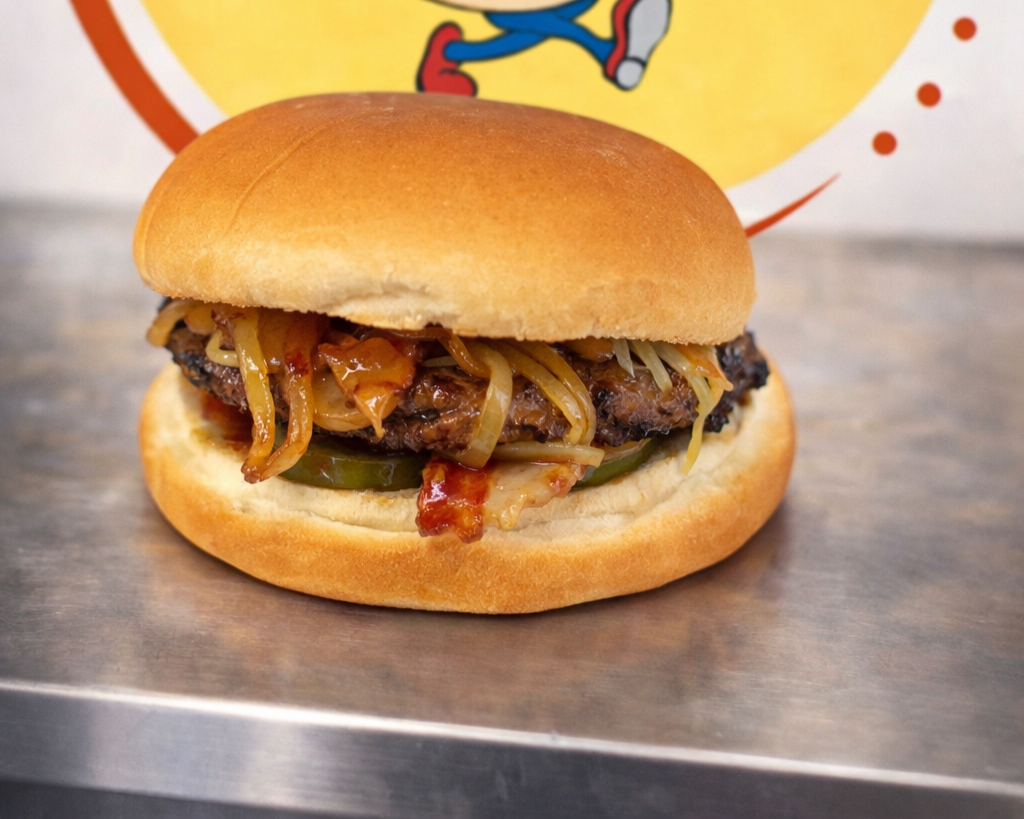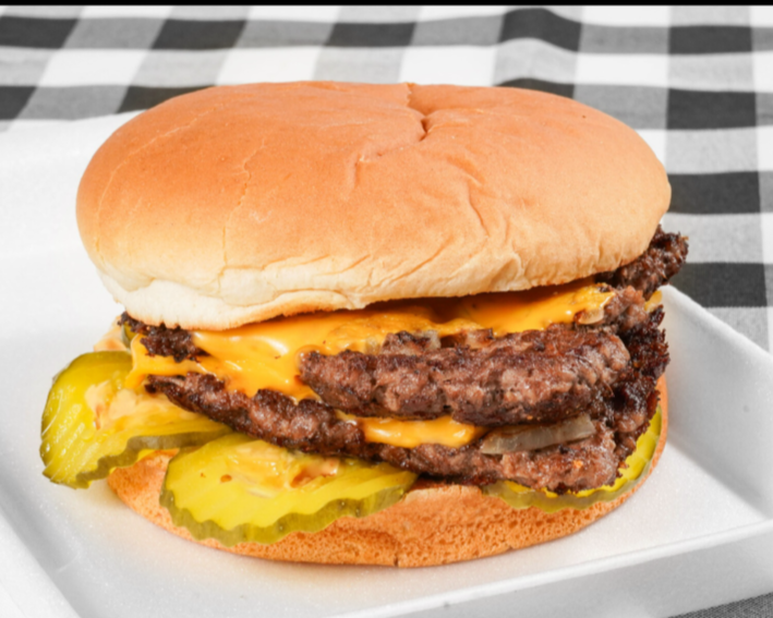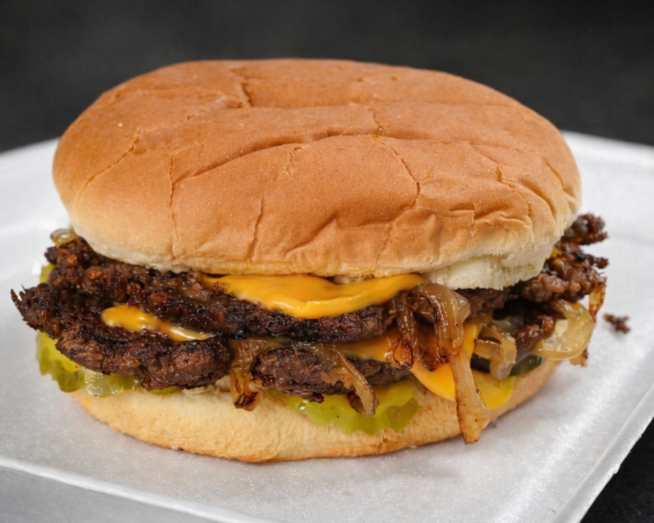 2 beef patties, grilled onions, pickles, mustard, American cheese
