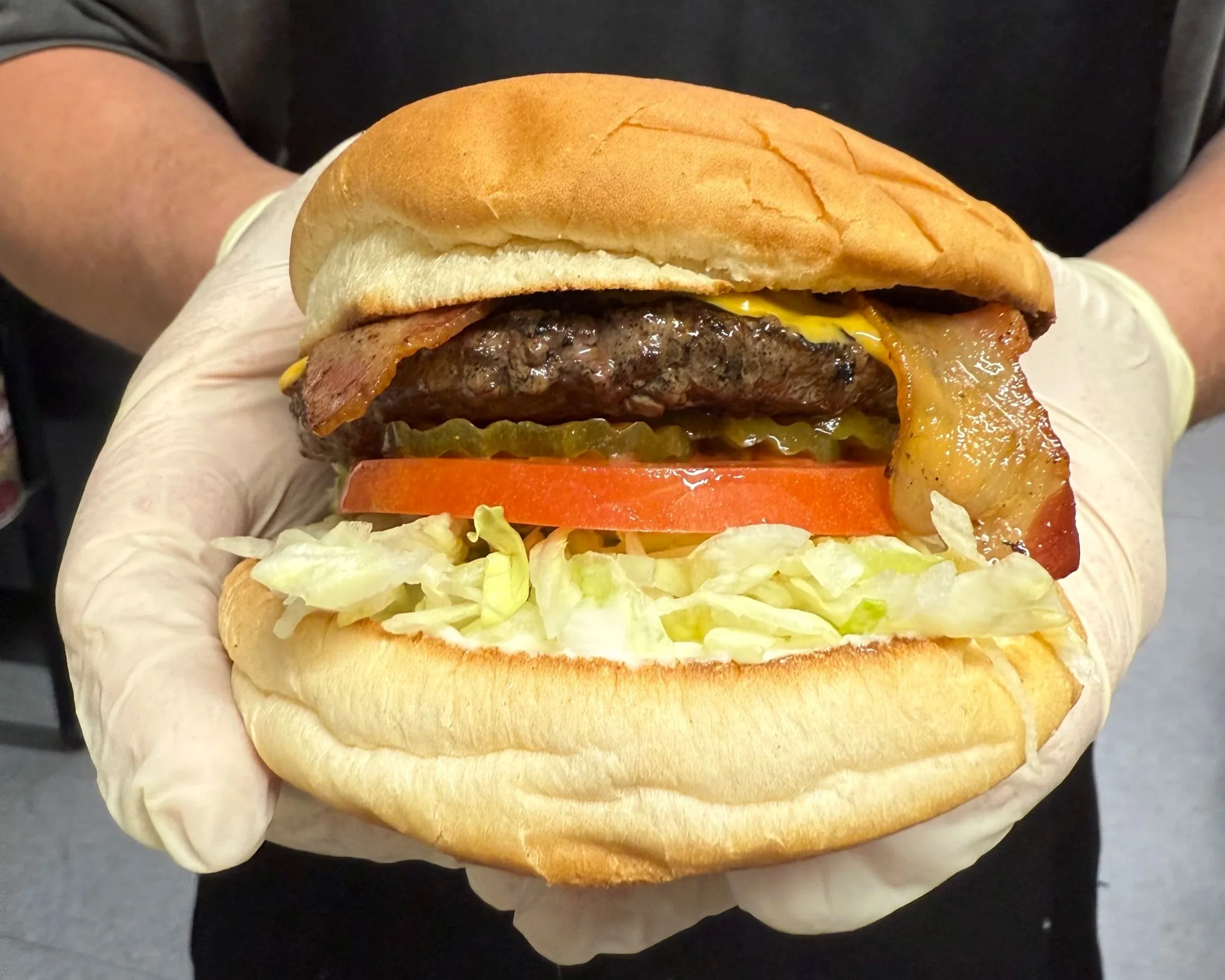 1/3 pound charbroiled patty, mayo, lettuce, tomato, onions, pickles, bacon, American cheese