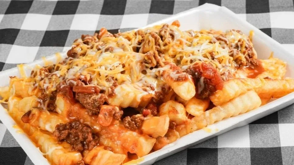 A generous pile of crispy fries loaded with homemade chili and melted cheese.